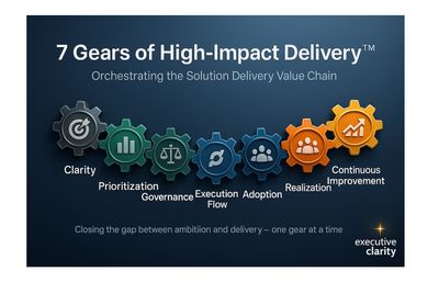 These challenges don’t reflect a lack of ambition or talent — they reveal the absence of a Solution Delivery Value Chain™, a structured mechanism that connects strategy to execution in a disciplined, prioritized, and outcome-driven way.